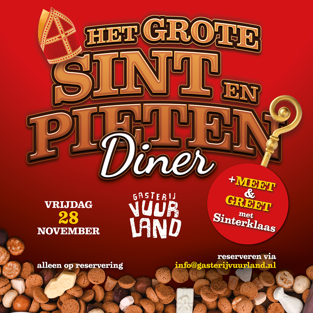 Op vrijdag 28 november is Sinterklaas met zijn pieten bij Gasterij Vuurland voor het Grote Sint- en Pietendiner. Speciaal voor de kleinste gasten is er tussen 17:30 en 18:30 uur een Meet and Greet met Sinterklaas. Dineren kan a la carte met de prijs die je van ons gewend bent.