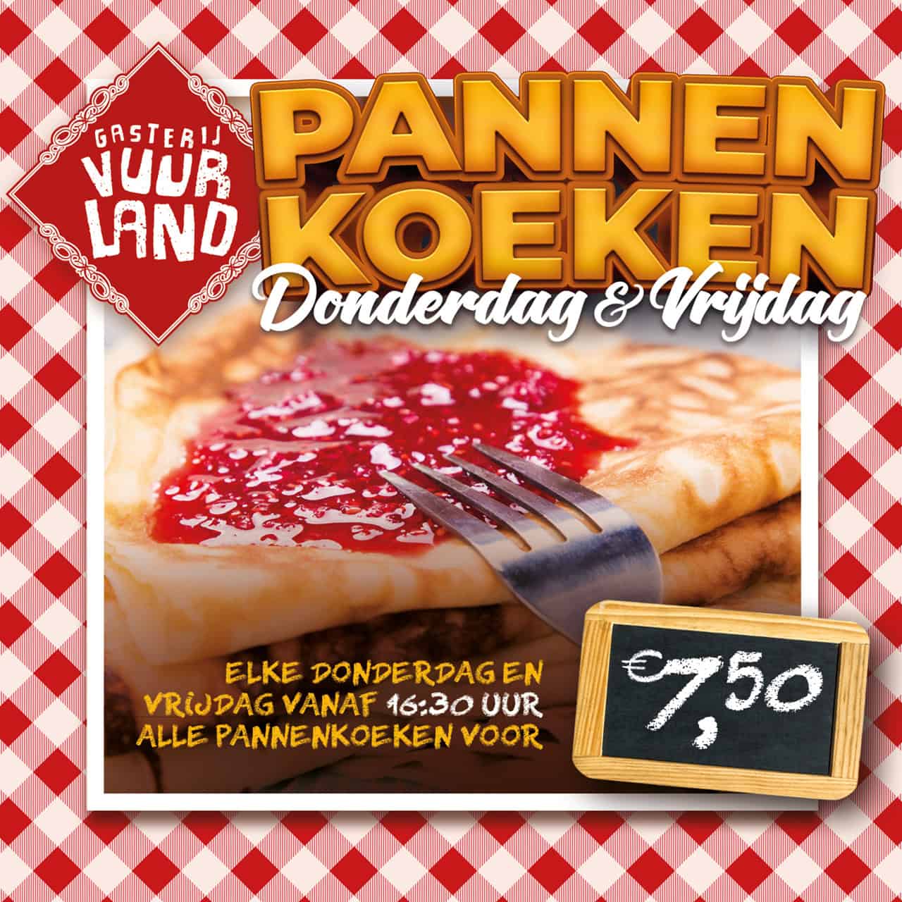 Iedere donderdag en vrijdag vanaf 16:30 uur geniet je bij Gasterij Vuurland van een pannenkoek voor slechts €7,50. Keuze uit wel 13 verschillende soorten! Vergeet je niet te reserveren?